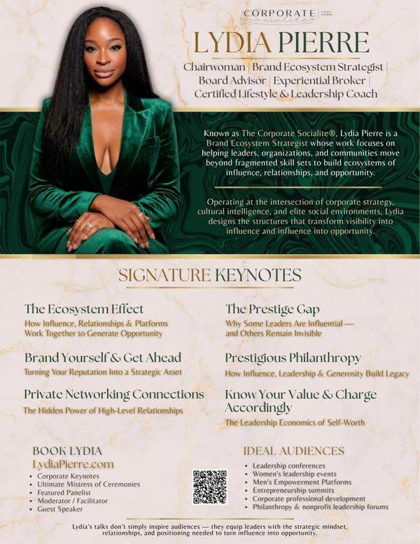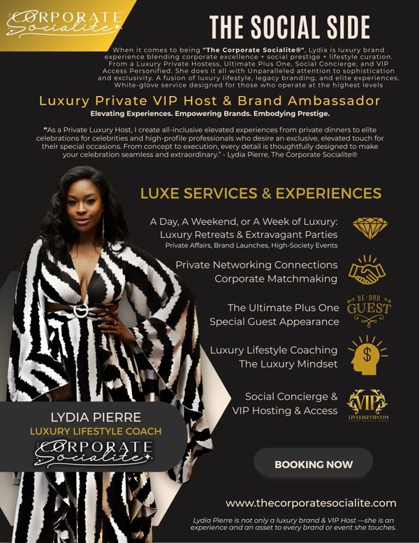 Every story has two sides—and Lydia Pierre, as The Corporate Socialite®, masterfully embodies both. Her journey bridges the boardroom and the ballroom, blending corporate precision with social brilliance to create a brand rooted in both strategy and soul.